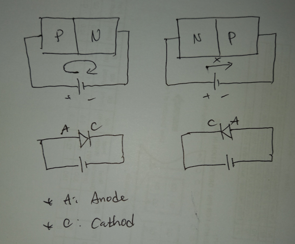 다이오드는 전류가 잘 흐르는 P형 반도체와 N형 반도체를 접합한 소자이다. 접합해 놓고 보니, PN 방향으로 +와 -를 공급하면 전류가 흐르고 NP방향으로 +와 -를 공급하면 전류가 차단된다. P는 정공, N은 전자가 다수캐리어이다.