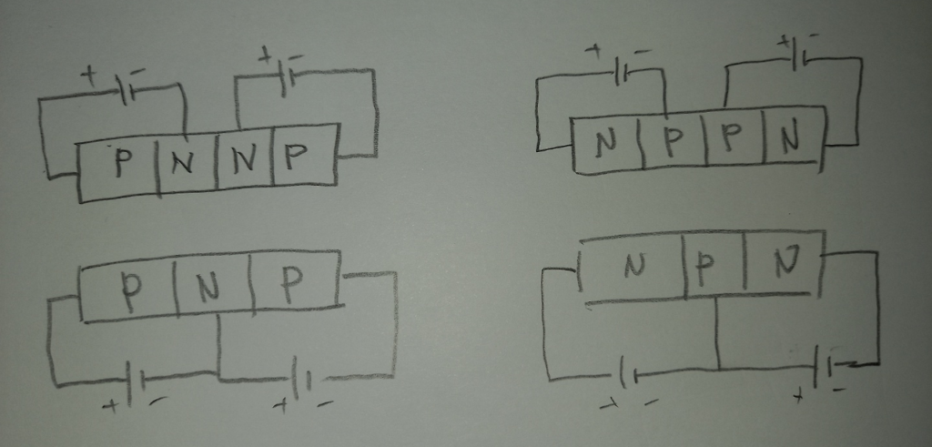 여기서 좌측의 PN이 없다고 가정하면 우측의 NP는 공핍영역이 증가해서 전류가 흐르지 못한다. 그런데 좌측에 정방향 바이어스가 걸려있으면 정공이 넘어와 N형을 P형으로 오염시킨다. 그러면 역방향 걸린것처럼 행동하던 우측의 NP형은 PP가 되었으므로 전류를 매우 잘 흘려보낸다.