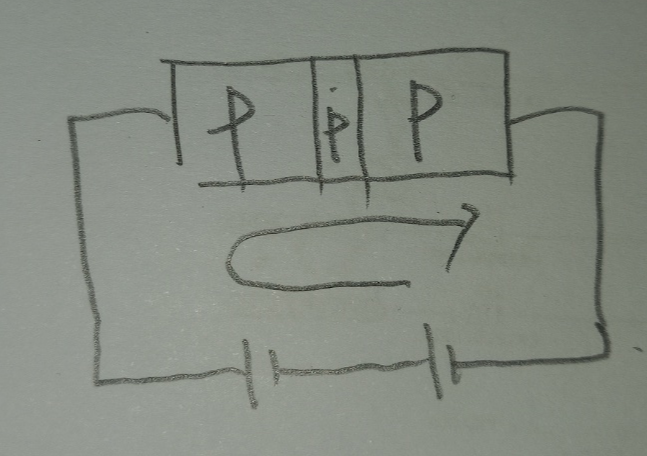 그러면 위 그림과 같이 해석할 수 있으며 대부분의 전류는 좌측에서 우측으로 흐르게 된다. (중간의 베이스에 연결된 선을 제거해서 그렸다. 이유는 대부분의 전류가 베이스로 누설되지 않고 오른쪽으로 통과하기 때문이다.)